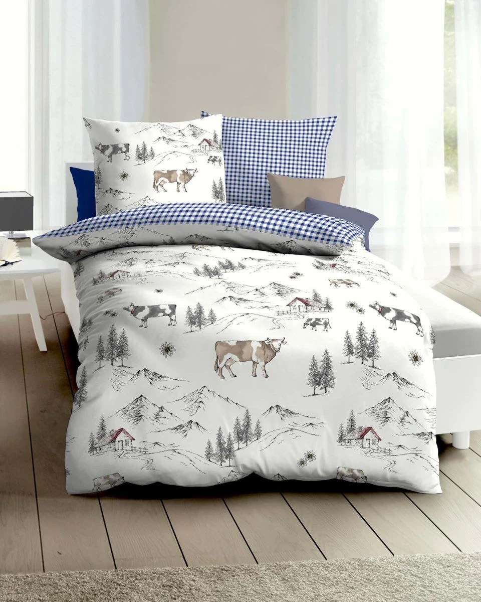 - Für alle die Alpen und den gemütlichen Landhausstil lieben: Feinbiber Wendebettwäsche mit Almhütte, Kühen, Bergen und Tannen