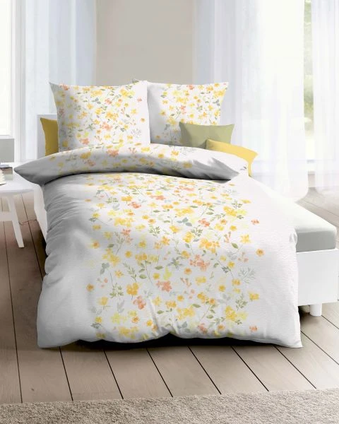 - Sommerfrische pur: Seersucker Bettwäsche Aurelia 275 mit floralem Dessin in sommerlichen Gelbtönen auf frischem, weißem Hintergrund