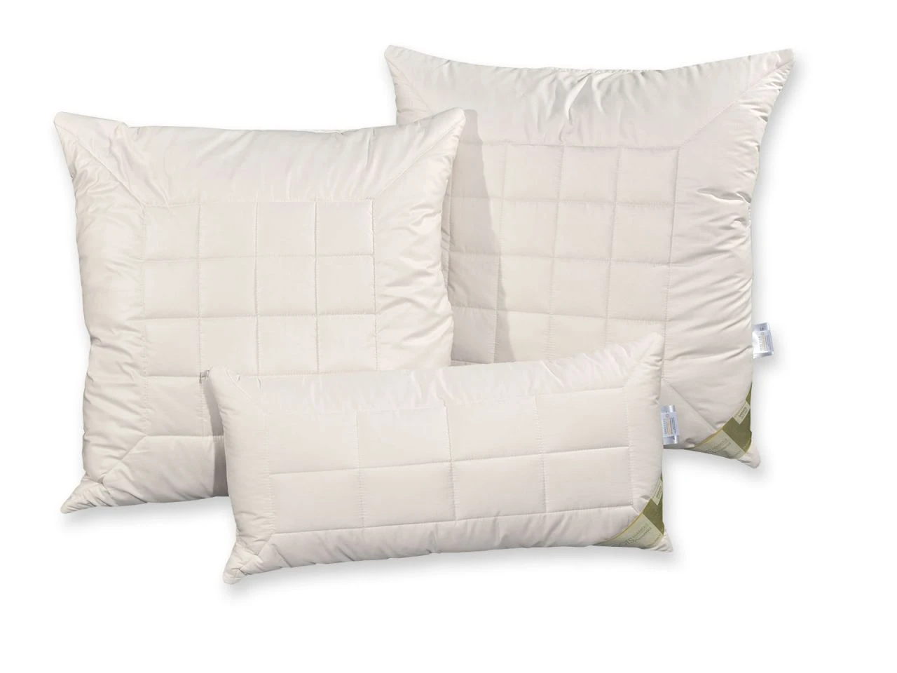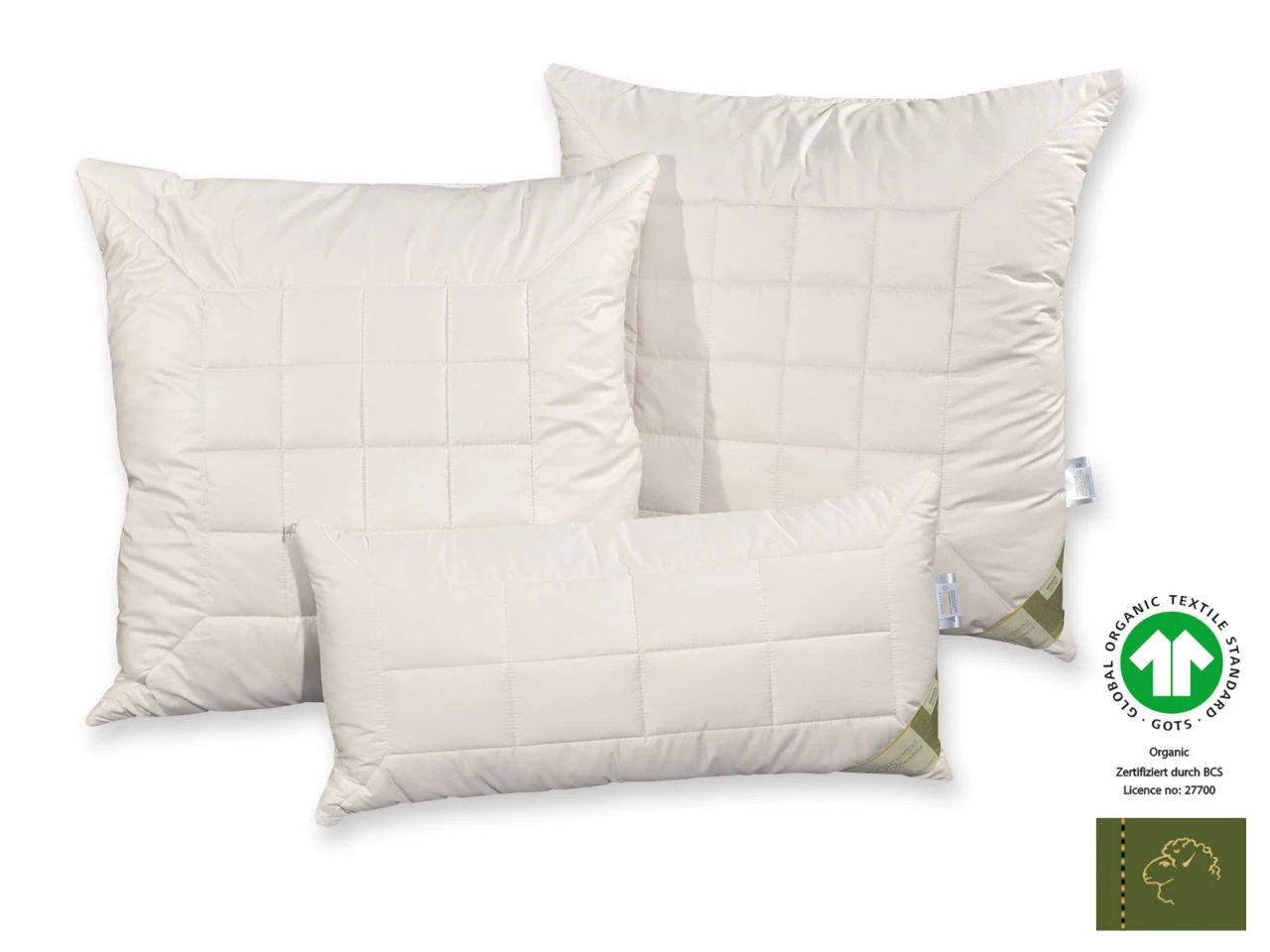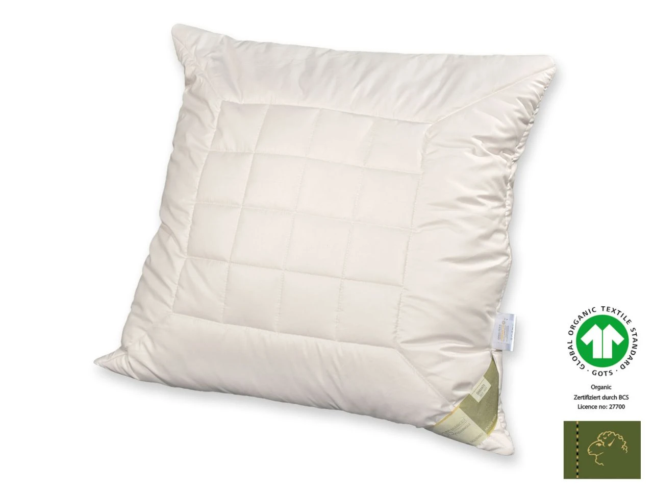 - Kopfkissen mit Bio-Baumwoll-Satin-Bezug versteppt mit reiner Bio-Schurwolle und einem Innenkissen aus Baumwollperkal mit Bio-Schurwollkugeln