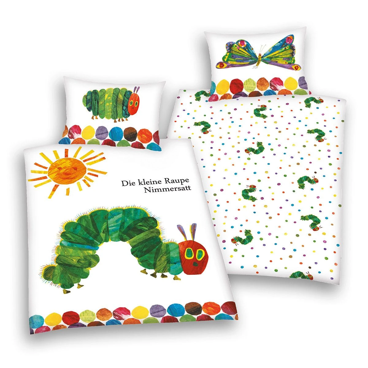 - Wunderschöne Kinder-Wendebettwäsche mit dem bekannten Motiv der Kleinen Raupe Nimmersatt, die sich an jedem Wochentag durch ein Lebensmittel frißt, schön rund und dick wird, um sich dann nach einer Woche in einen wunderschönen Schmetterling zu verwandeln