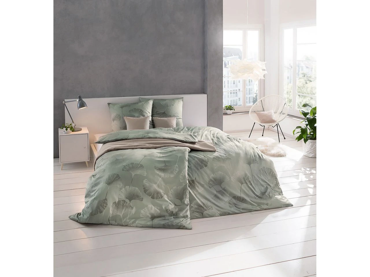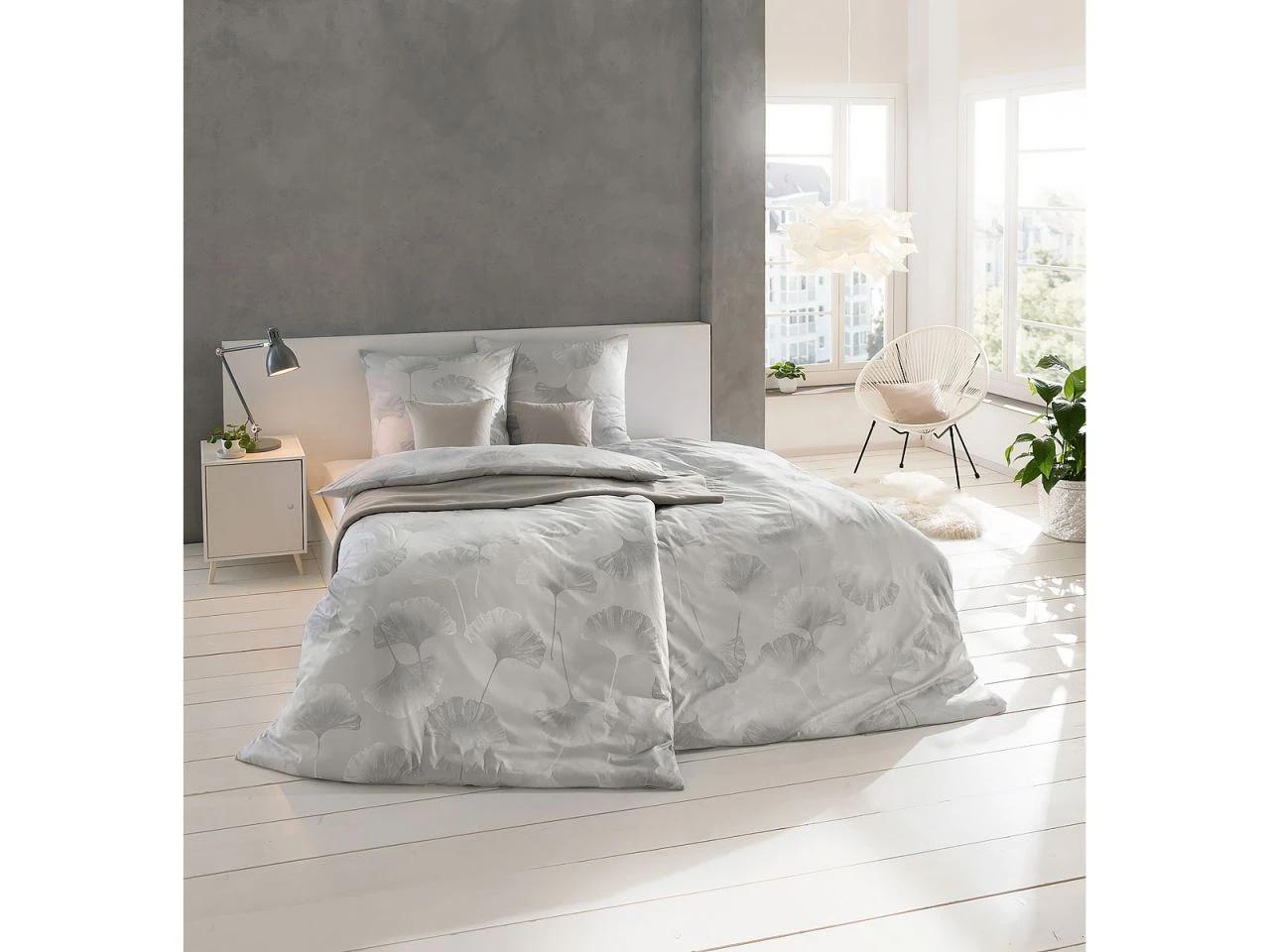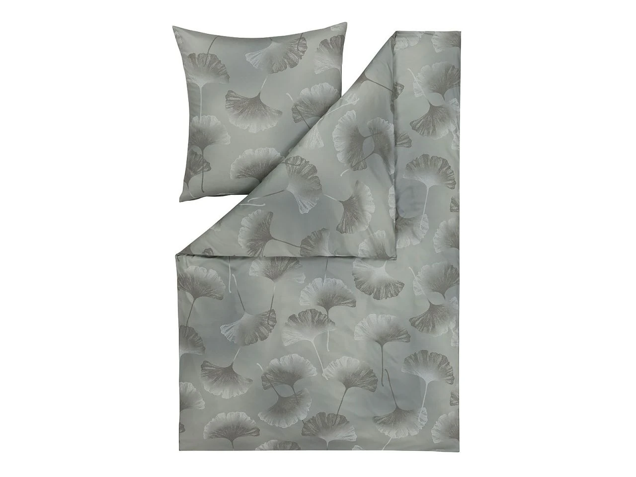 - Stilvolle Natürlichkeit: Mako-Interlock-Jersey Bettwäsche Isabella 6862 mit großfächigen Ginkgoblättern in dezenten Grau-Tönen kombiniert mit wunderschönen, leicht schimmernden Grundfarben