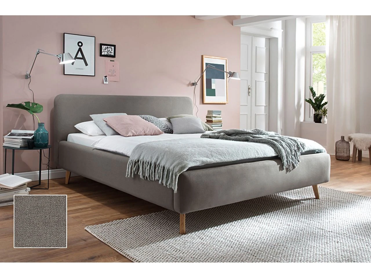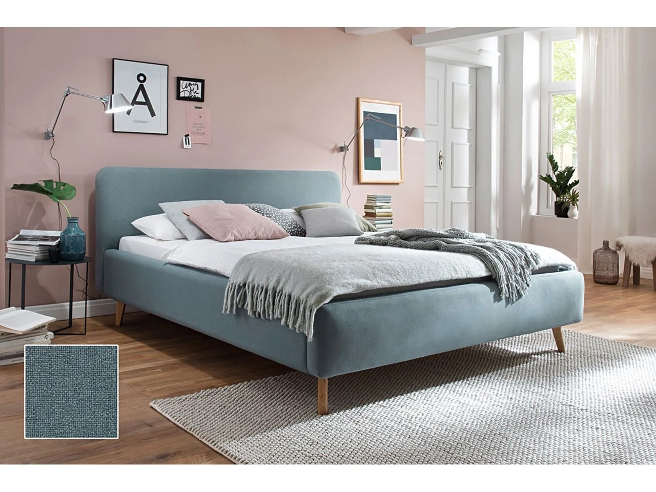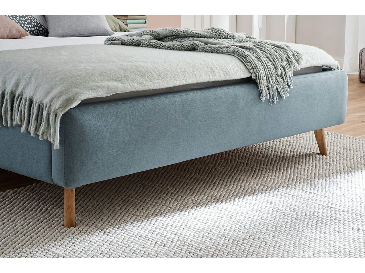 - Massive, eichefarbige und fein wirkendende Holzfüße harmonieren perfekt mit den sanften Farben und der schlichter Form des Bettes