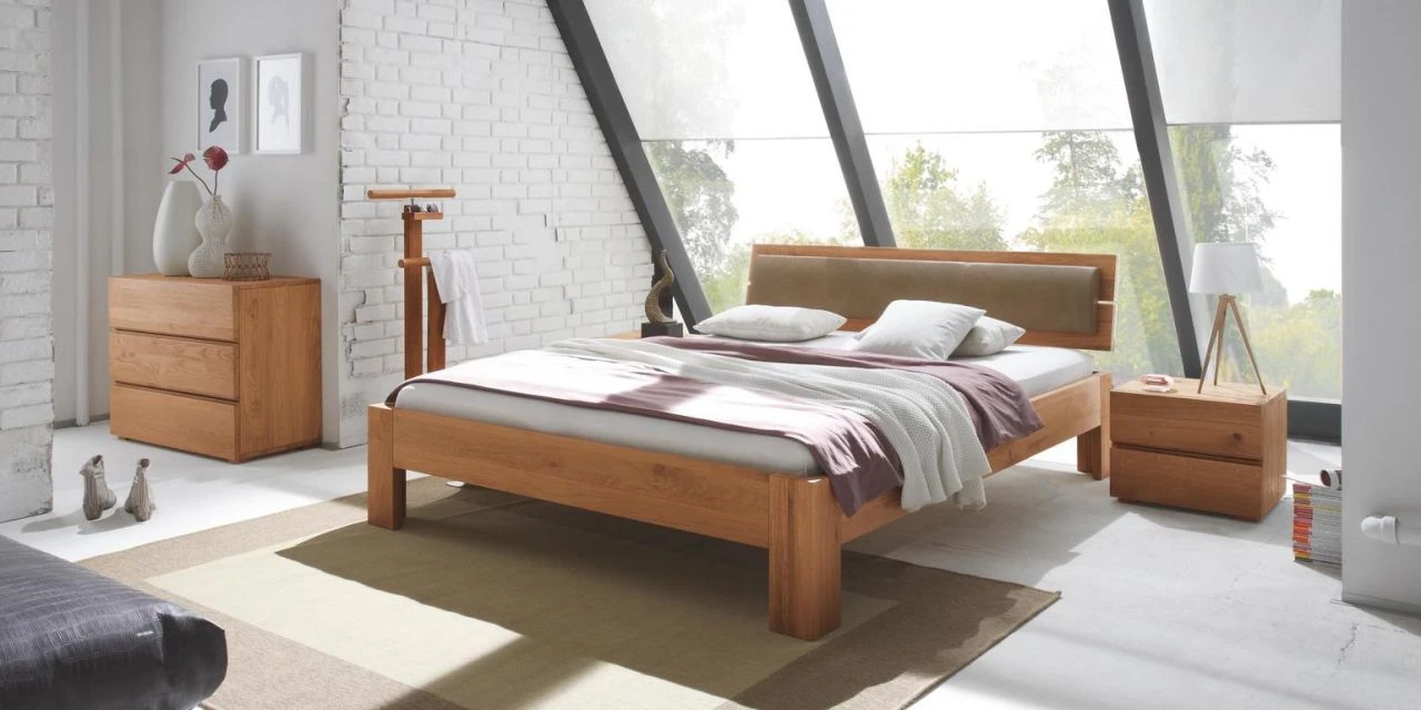 Schlicht, ruhig und natürlich wirkt der massive, geradlinige Bettrahmen aus Eichenholz, kombiniert mit den geraden Füssen Corno und dem formschönen und bequemen, abgeschrägtem Kopfteil Alpa mit Kissen Lumo.