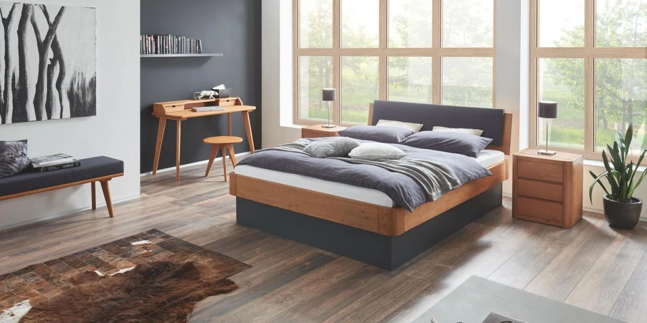 Der elegante Bettrahmen aus massivem Eichenholz mit schönster Farbbrillianz wirkt durch das Kopfteil Varus behaglich und elegant. Das Kissen Ravo in Anthrazit auf dem Kopfteil bietet Komfort und setzt einen farblichen Akzent. Die Practico-Ron Box bietet einen tollen Farbkontrast und praktischen Stauraum für Bettdecken und Kissen.