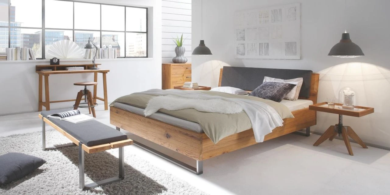 Die Besonderheit des Einlegerahmens Cadro 23 ist , dass er in 2 Einlegetiefen anwendbar ist. Bei der Tiefe von 18 cm können die Füße 5 cm versenkt werden und das Bett gewinnt somit mehr Bodennähe, die Füße treten optisch in den Hintergrund. Die Kombination aus Wildeiche, Stahlfüßen Indus und dem Kopfteil Sion mit Kissen Ravo ergibt ein klarliniges, modernes und gemütliches Bett.