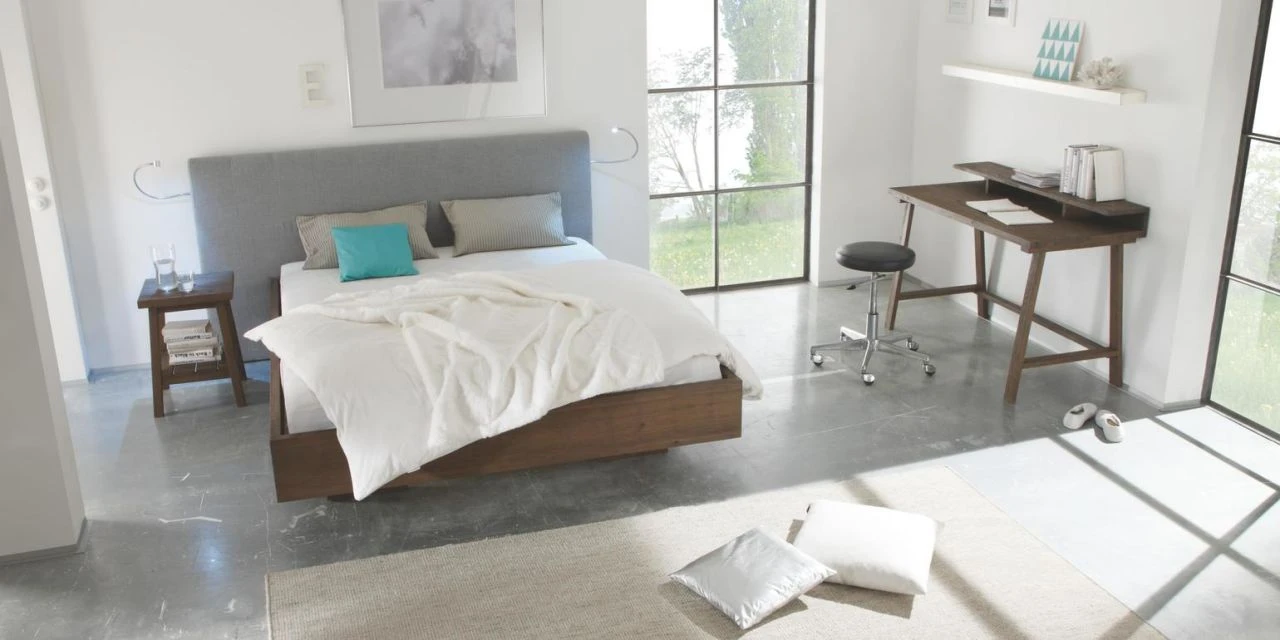 Die Besonderheit des Einlegerahmens Cadro 23 ist , dass er in 2 Einlegetiefen anwendbar ist. Bei der Tiefe von 18 cm können die Füße 5 cm versenkt werden und das Bett gewinnt somit mehr Bodennähe, die Füße treten optisch in den Hintergrund. Bei diesem gemütlichen und leicht wirkendem Bett sind die Kufen Vilo zusätzlich vom Bettrand zurückversetzt, so dass das Bett wirkt, als ob es schwebe. Die Wandpaneele Colina sorgt für Bequemlichkeit und Komfort beim Lesen und beim Frühstücken im Bett.