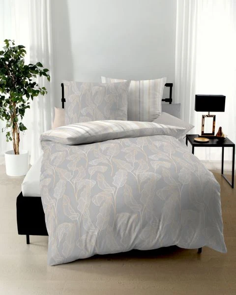 - Mako–Satin Wendebettwäsche mit dezentem, floralem Dessin auf der Vorderseite und Streifen-Dessin auf der Rückseite