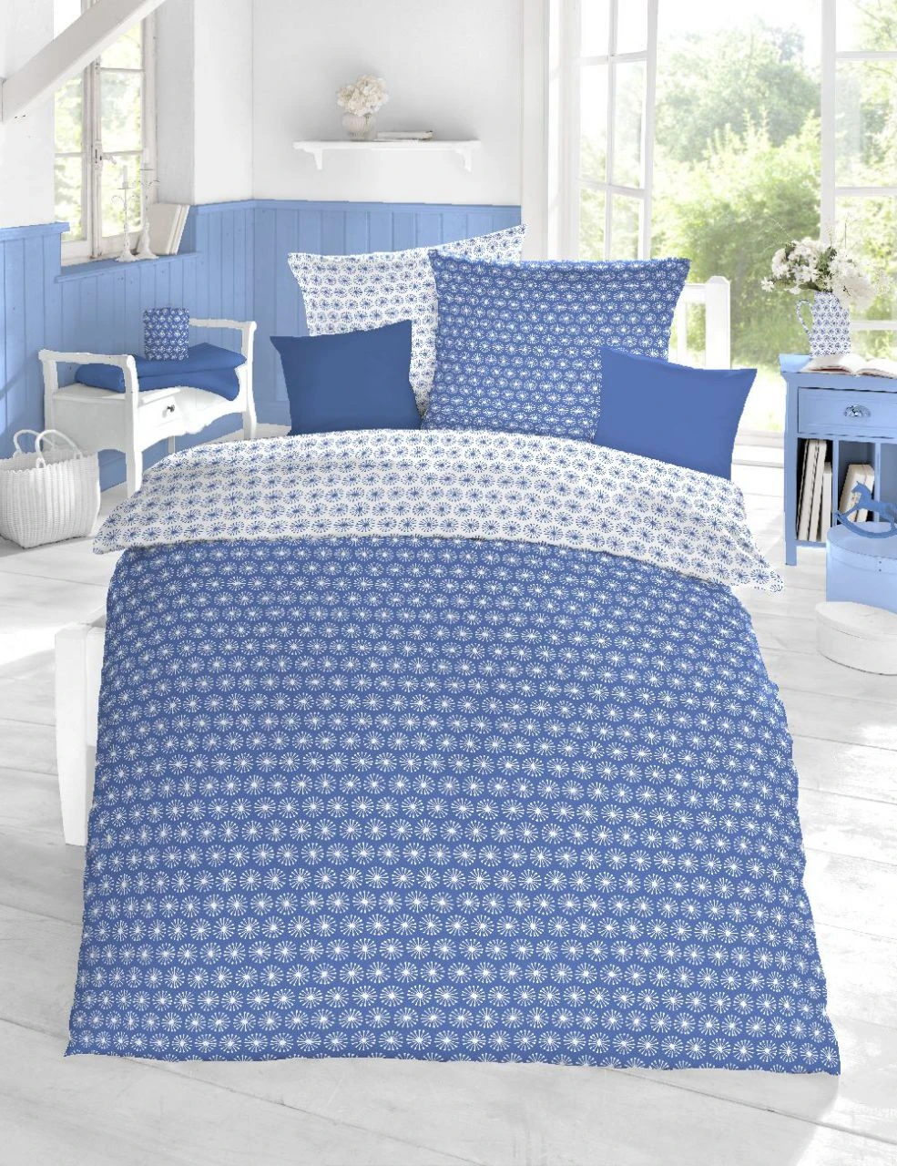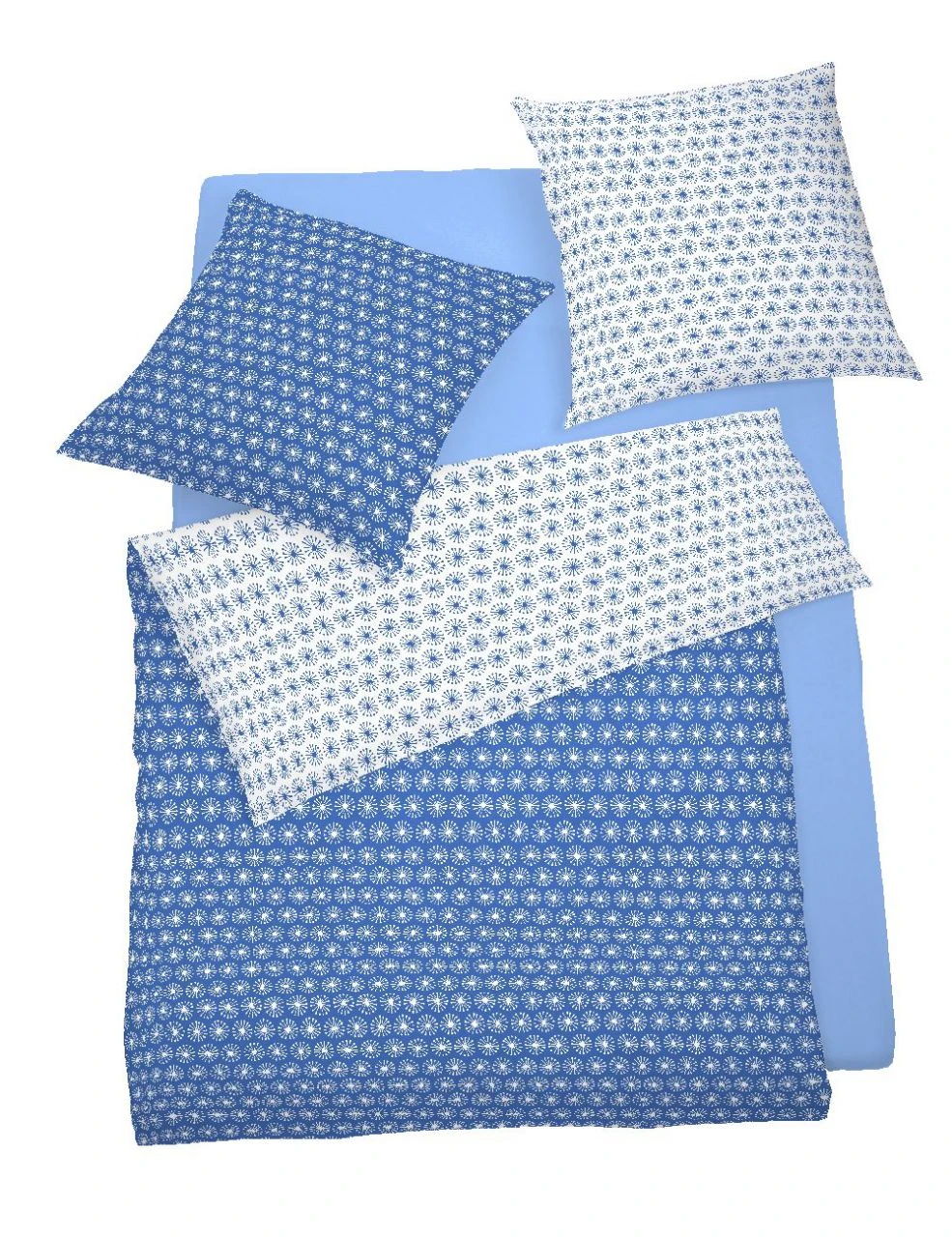 - Sommerliche anmutende Mako–Satin Wendebettwäsche Vista von schlafgut in der frischen Farbkombination Blau- Weiss