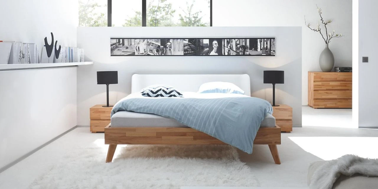 Der Rahmen Classic 16 überzeugt durch seine natürliche, wame Oberfläche und seine klare, schlichte Form. Jede der zahlreichen Holzausführungen wirkt durch ihre Farbe ganz unterschiedlich. Kombiniert mit dem gepolstertem Kopfteil Boga mit Kunstleder-Bezug Campos blanc und den schrägstehenden, zierlichen Füßen Leno entsteht ein leicht wirkendes, modernes und bequemes Bett, welches zum Verweilen einlädt.