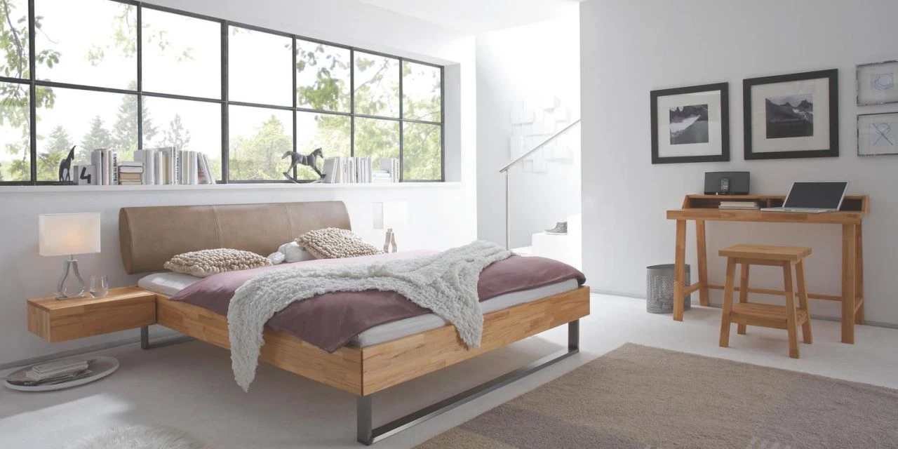 Der Rahmen Classic 16 überzeugt durch seine natürliche, wame Oberfläche und seine klare, schlichte Form. Jede der zahlreichen Holzausführungen wirkt durch ihre Farbe ganz unterschiedlich. Kombiniert mit dem gepolstertem Kopfteil Elipsa mit Kunstleder-Bezug Casual in der Farbe cannelle, einem warmen Zimt-Ton, und den Kufen Indus aus Metall entsteht ein leicht wirkendes, bequemes Bett, bei dem die verschiedenen Materialien und Holzarten perfekt harmonieren.